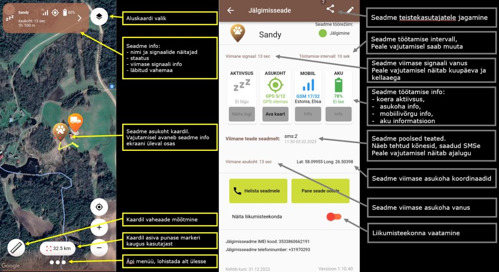 - Uus kaardivaade, kus koera kohta näidatakse infot ekraani ülemises osas. Näidatav info on selgem sh näidatakse seadme hetke seisundi indikaatorit ning kui palju on seade viimasel ajal liikunud GPS koordinaatide muutuste järgi.